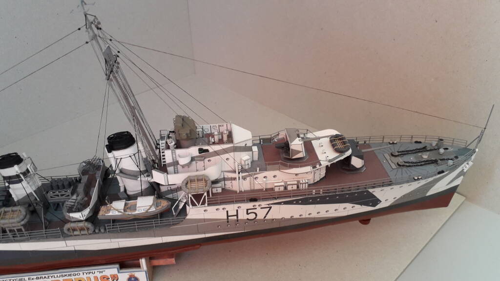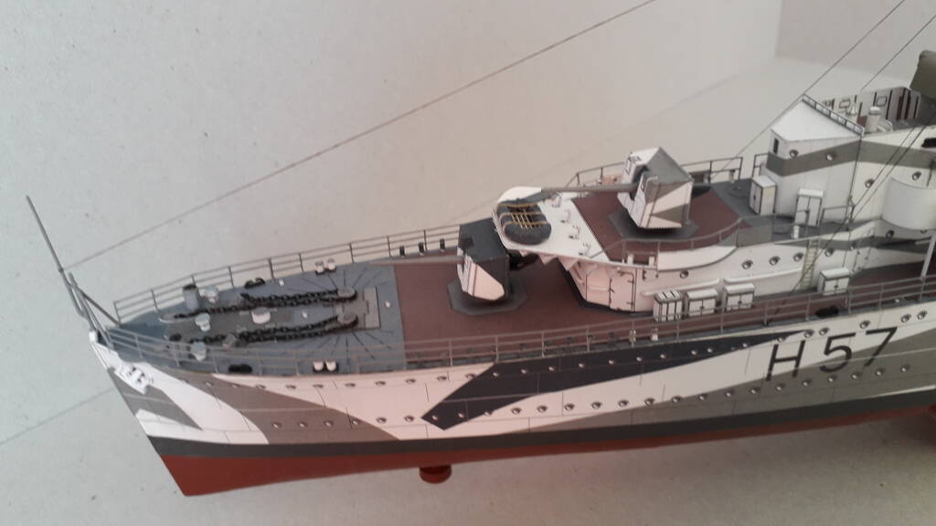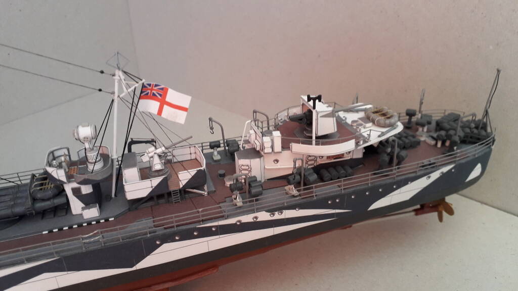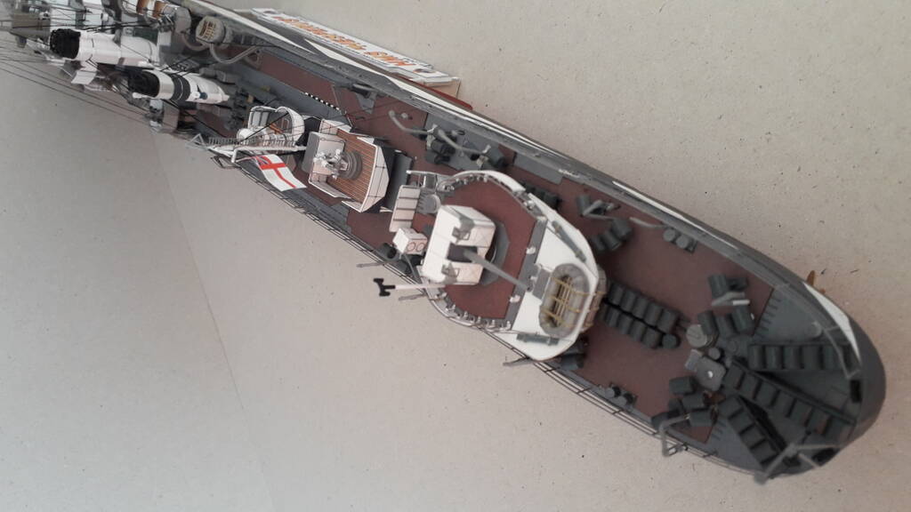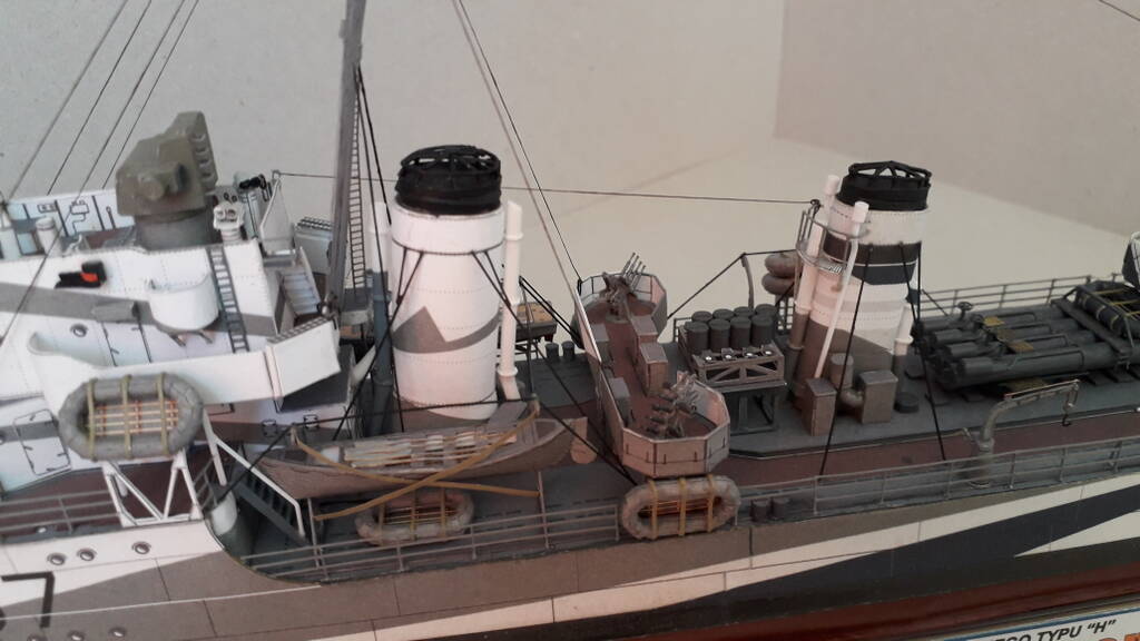 Моя первая собранная модель из бумаги. Из дополнений использовались лазерная резка каркаса, вертикальных трапов и лееров, а также металлические стволы артиллерии. Сборка особых сложностей не вызвала. Хорошая детализация, качество бумаги и печати на уровне.