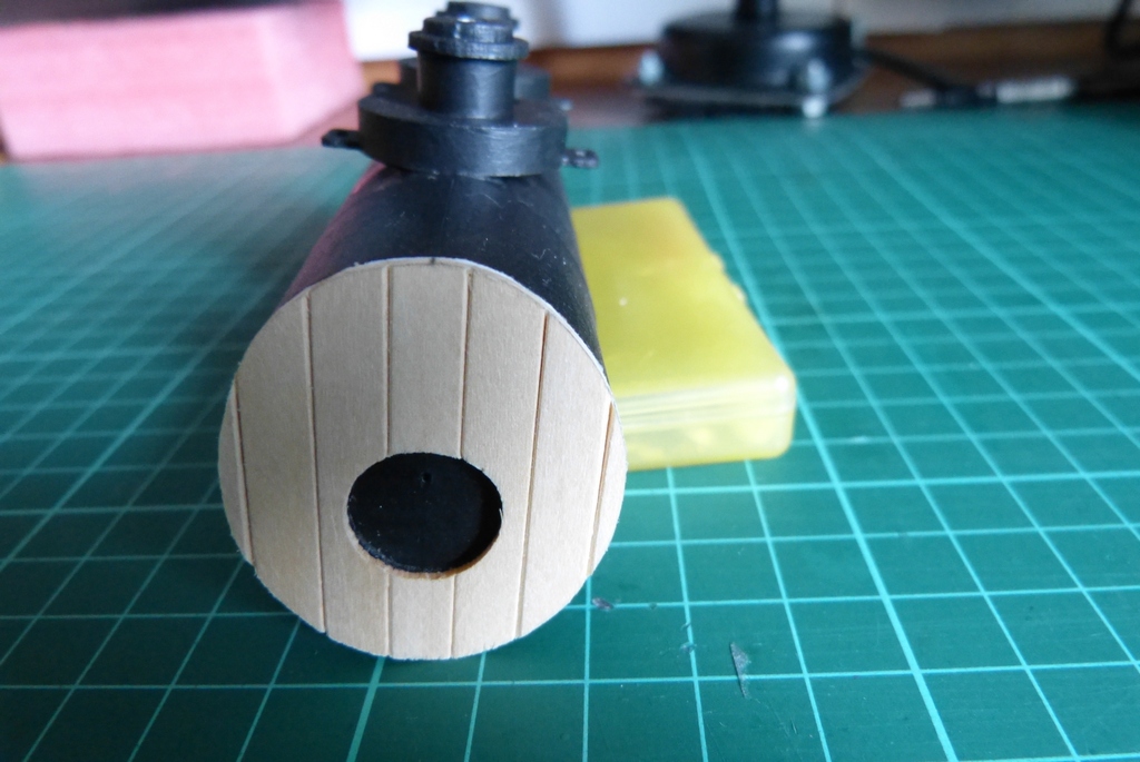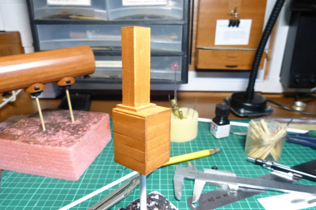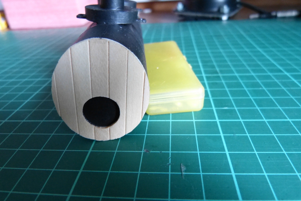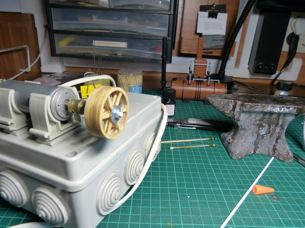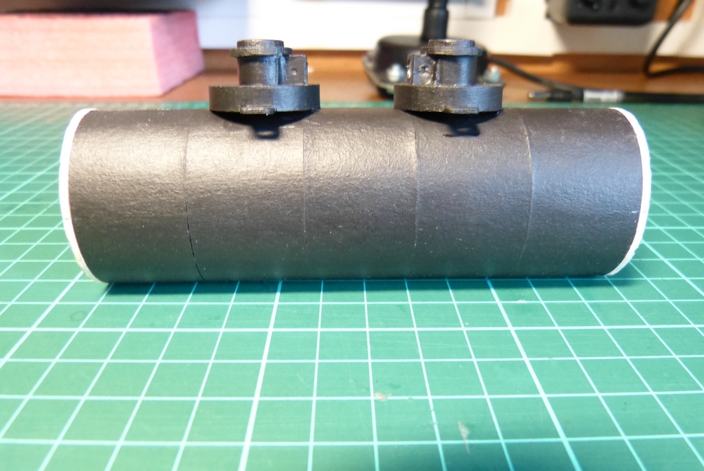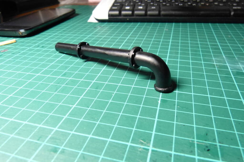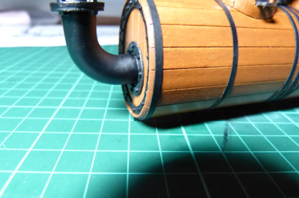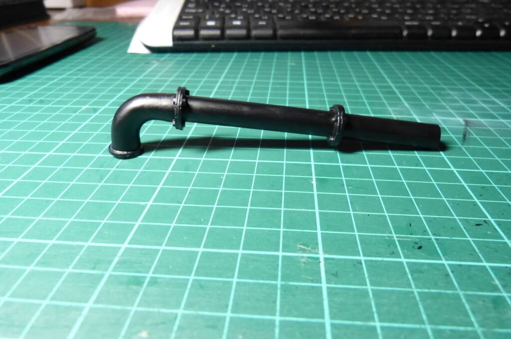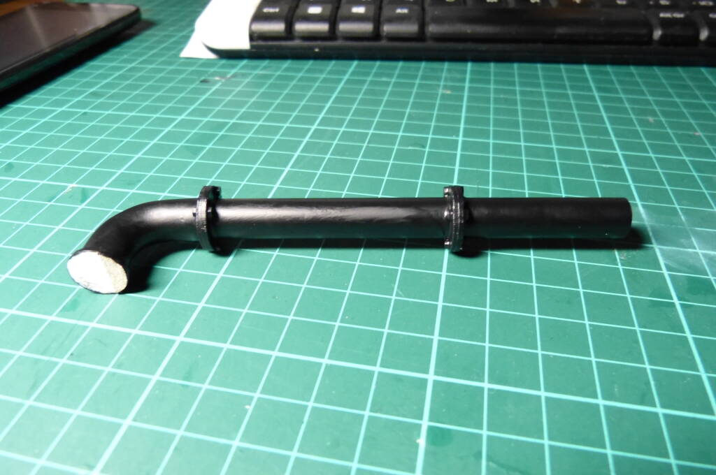 Дымовая труба,поворот трубы к котлу делался так : набрано бутербродом,потом зашкурено,пропитано суперклеем и обработано наждаком и покрашено,труба тоже крутилась из офиски,пропитывалась суперклеем на ручной дрели обработана наждаком приклеена к повороту и все вместе покрашено.Дымовая труба на котле