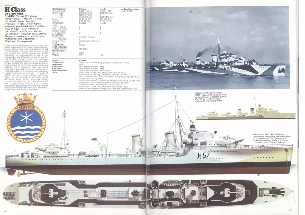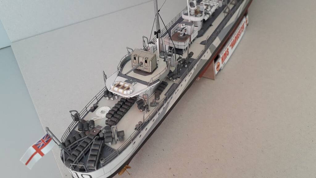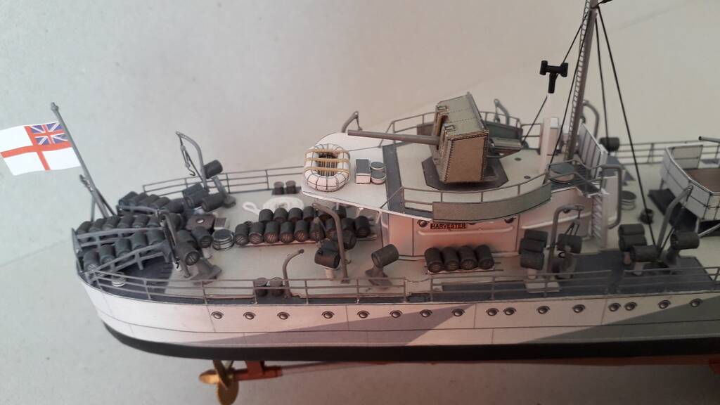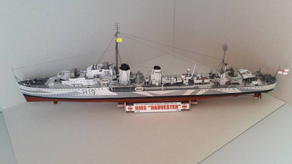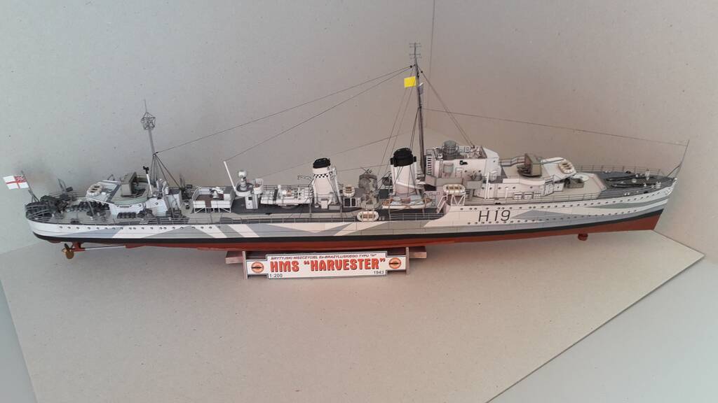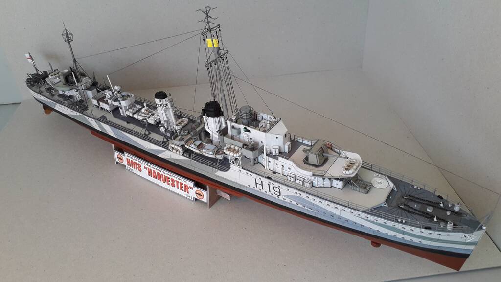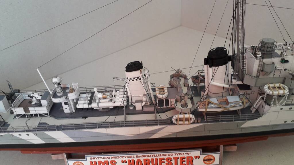 Всем доброго дня! Модель британского эсминца Harvester, однотипного с HMS Hesperus по состоянию на 1943 год. Один из шести эсминцев, заказанных правительством Бразилии в 1938 году по типу построенных для британского флота эсминцев типа Н. Принимал активное участие во ВМВ, действовал у Дюнкерка, в Атлантике и на Средиземном море. 10 марта 1943 года в Северной Атлантике, при сопровождении конвоя потерял ход в результате повреждения форштевня после тарана германской подводной лодки U-444 (лодка затонула), а на следующий день потоплен подводной лодкой U432.
