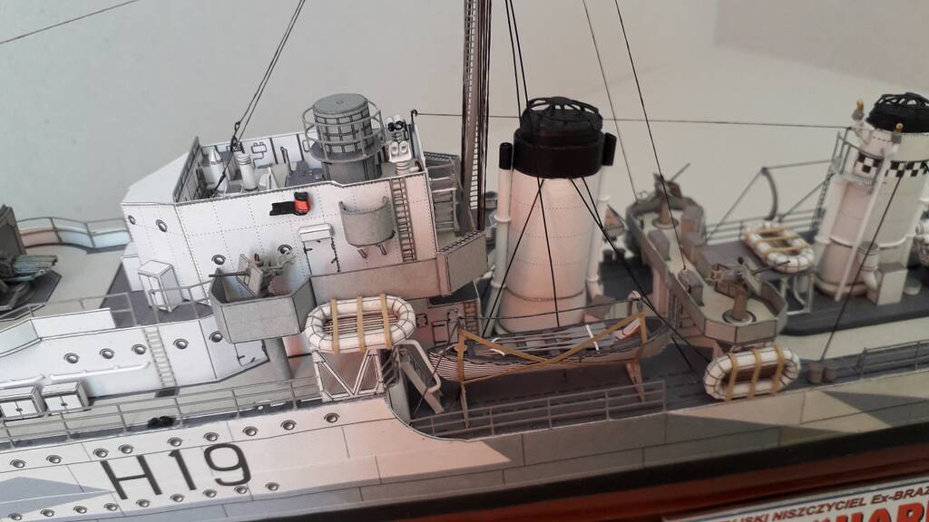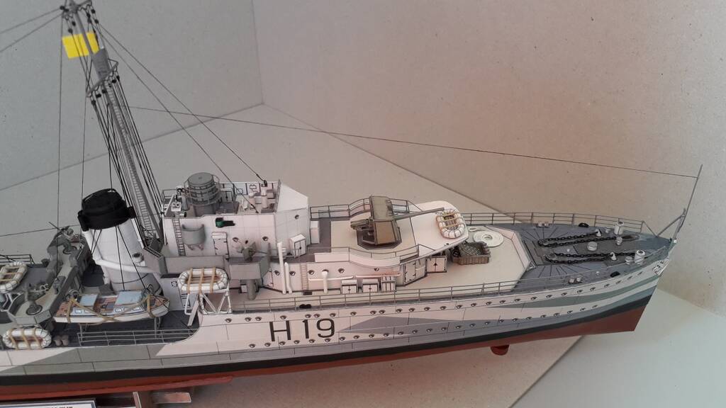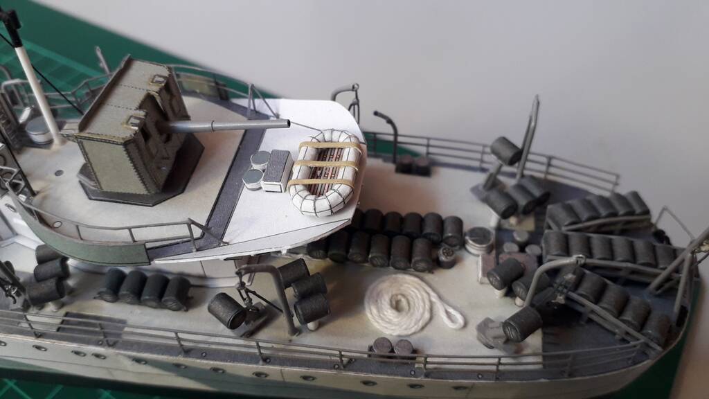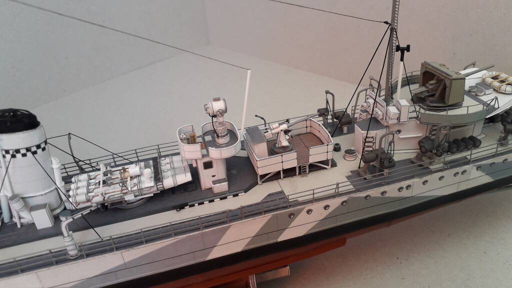 Модель собиралась с использованием лазерной резки каркаса от Hesperus, лееров, вертикальных трапов, металлических стволов артиллерийского вооружения. Свои доработки касательно торпедного аппарата, противолодочного вооружения, шлюпочного устройства. Сходимость у модели хорошая, бумага и печать качественные.