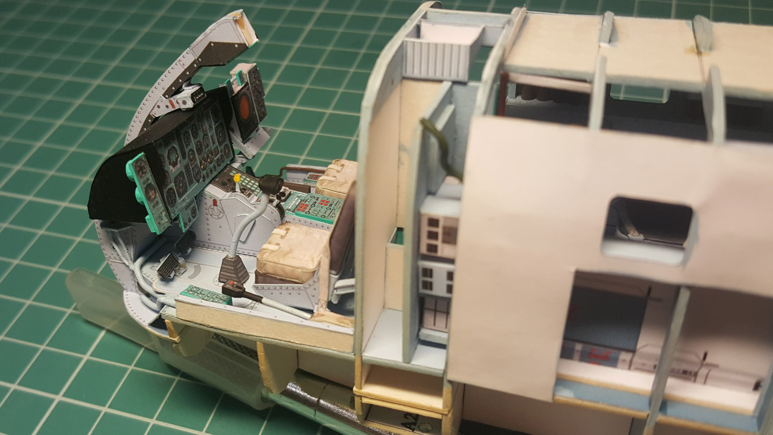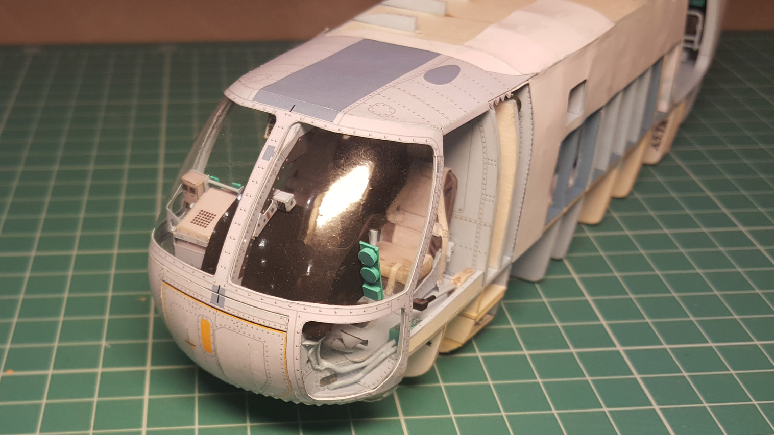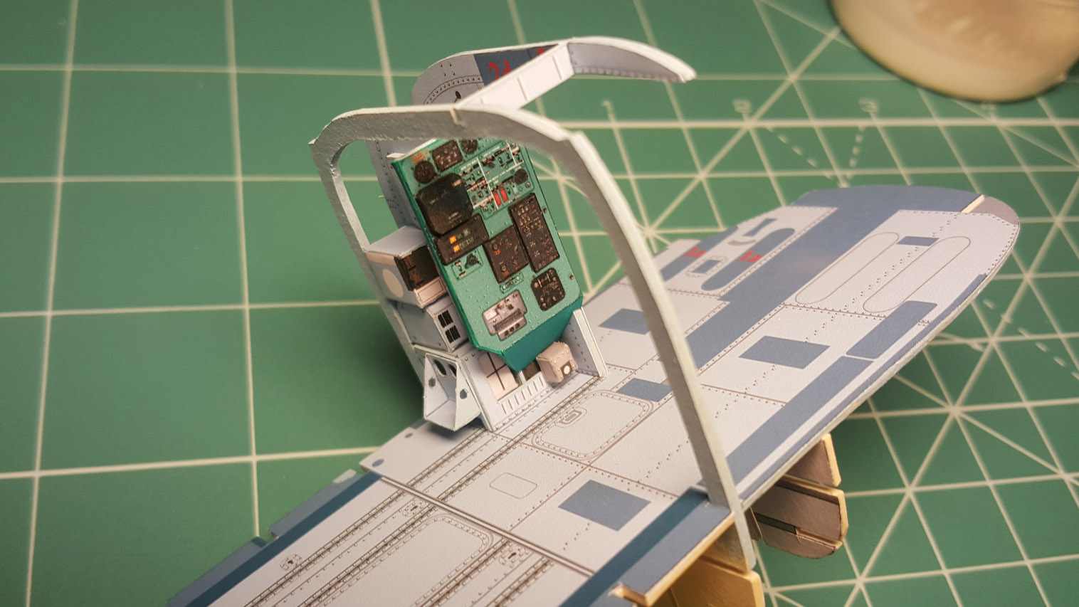 Следующим этапом стала приклейка "внутреннего" переплёта и потолка кабины. Внутренний переплёт напечатал на самоклейке Ламонд (было до нахождения чудо клея). Работать с ней сложнее. Она тонкая и вытягивается, поэтому огрехов не прощает. Да и цвет на ней печатается другой почему то. Тем не менее и этот этап сборки был пройден и фонарь был вклеен на место.