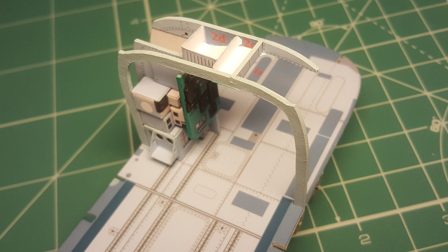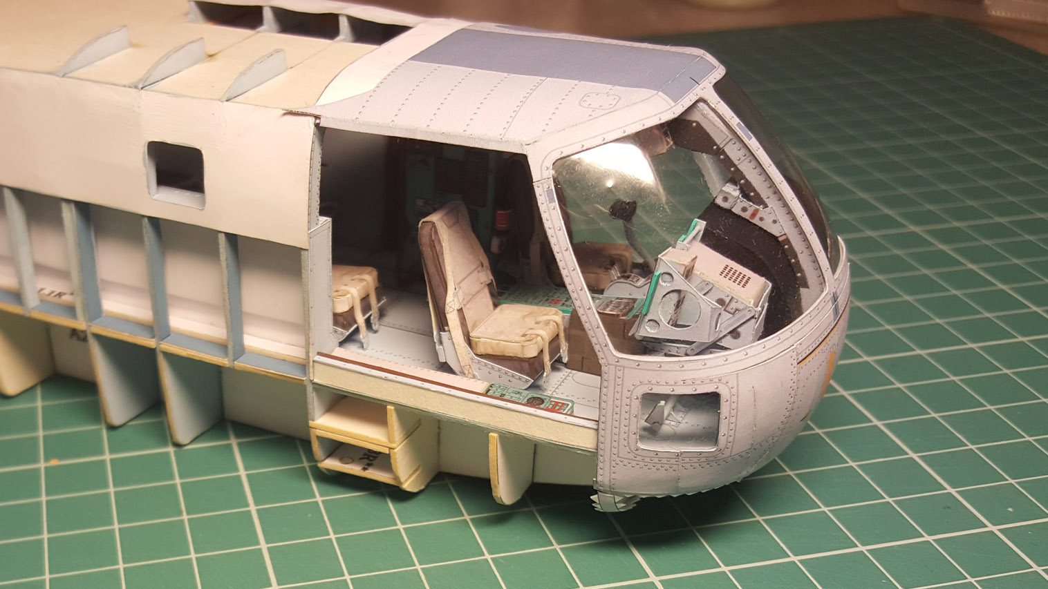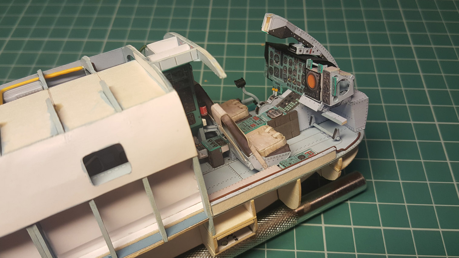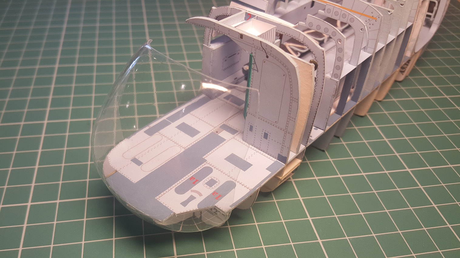 Следующим этапом стала приклейка "внутреннего" переплёта и потолка кабины. Внутренний переплёт напечатал на самоклейке Ламонд (было до нахождения чудо клея). Работать с ней сложнее. Она тонкая и вытягивается, поэтому огрехов не прощает. Да и цвет на ней печатается другой почему то. Тем не менее и этот этап сборки был пройден и фонарь был вклеен на место.