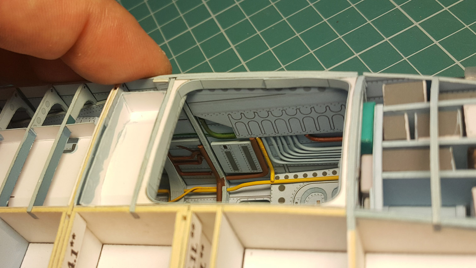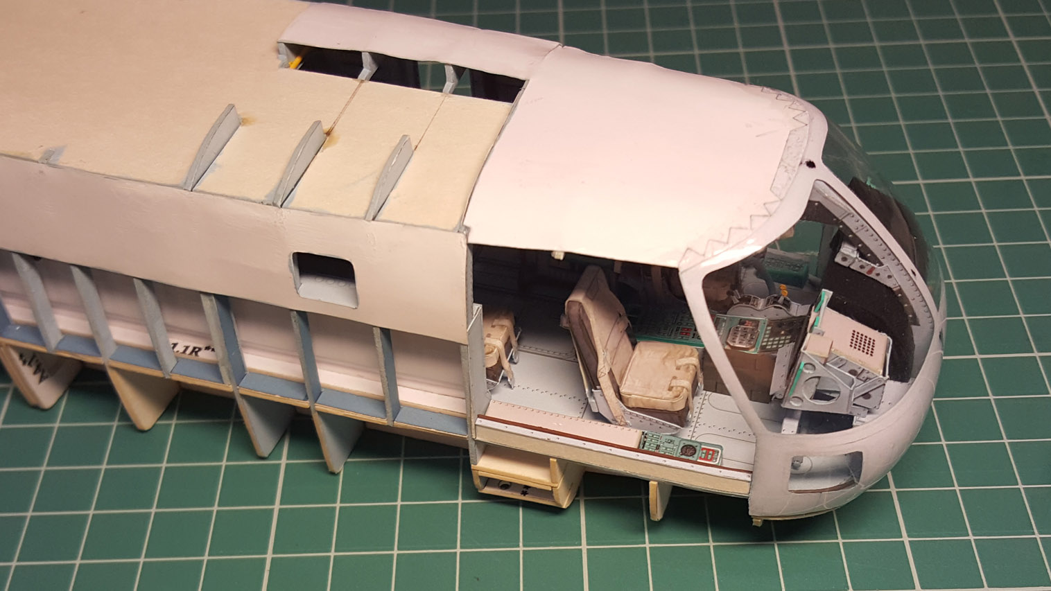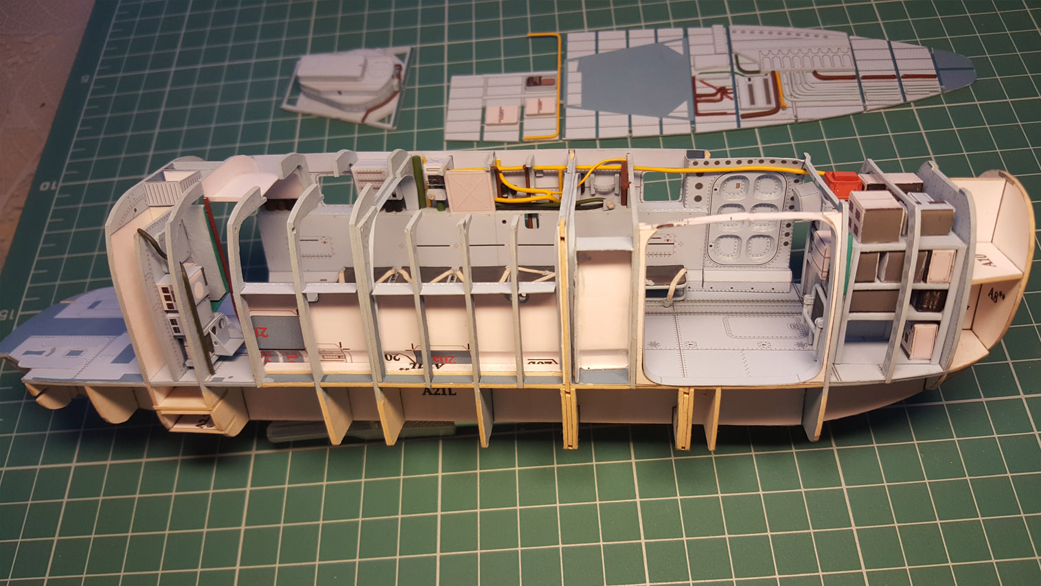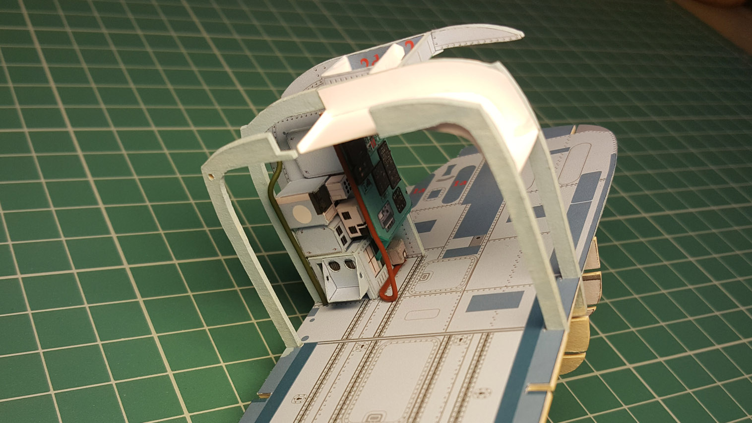 Сделал разводку. Выгнул жгут который проходит над шпангоутом, вклею после приклейки крыши на место. Кожух с каркасом положен на сухо. Его к крыше приклеивать не надо.