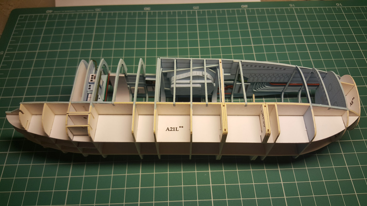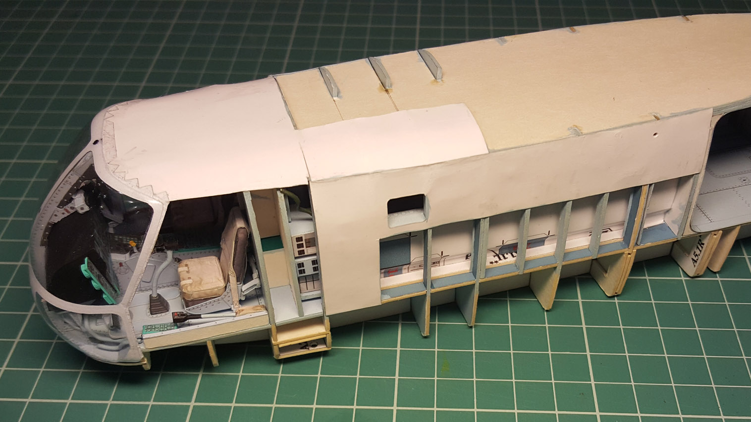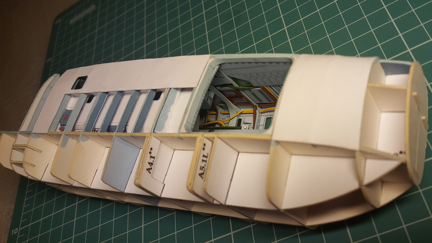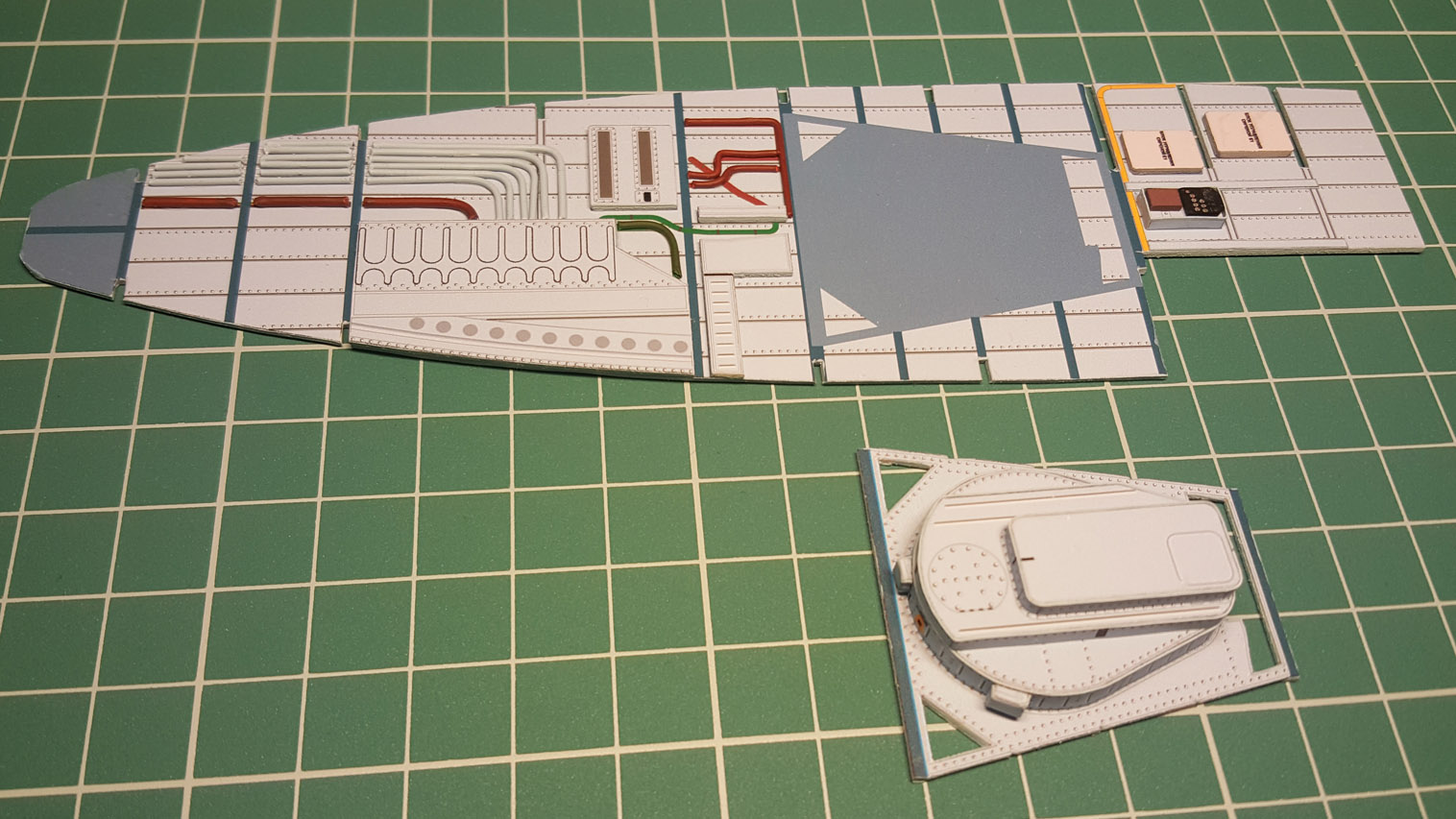 Сделал разводку. Выгнул жгут который проходит над шпангоутом, вклею после приклейки крыши на место. Кожух с каркасом положен на сухо. Его к крыше приклеивать не надо.
