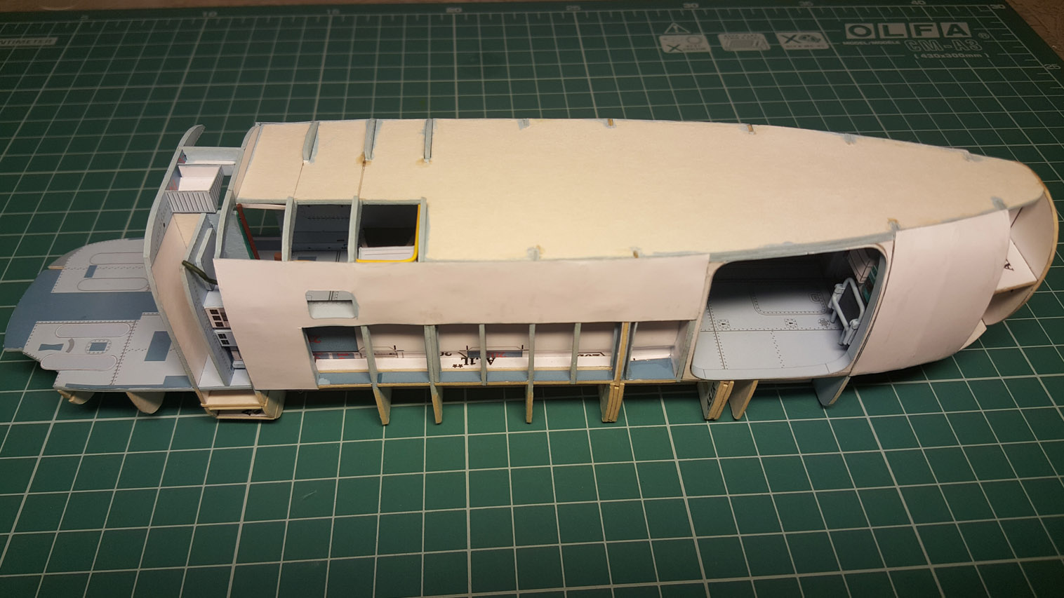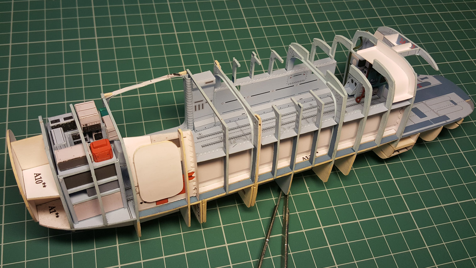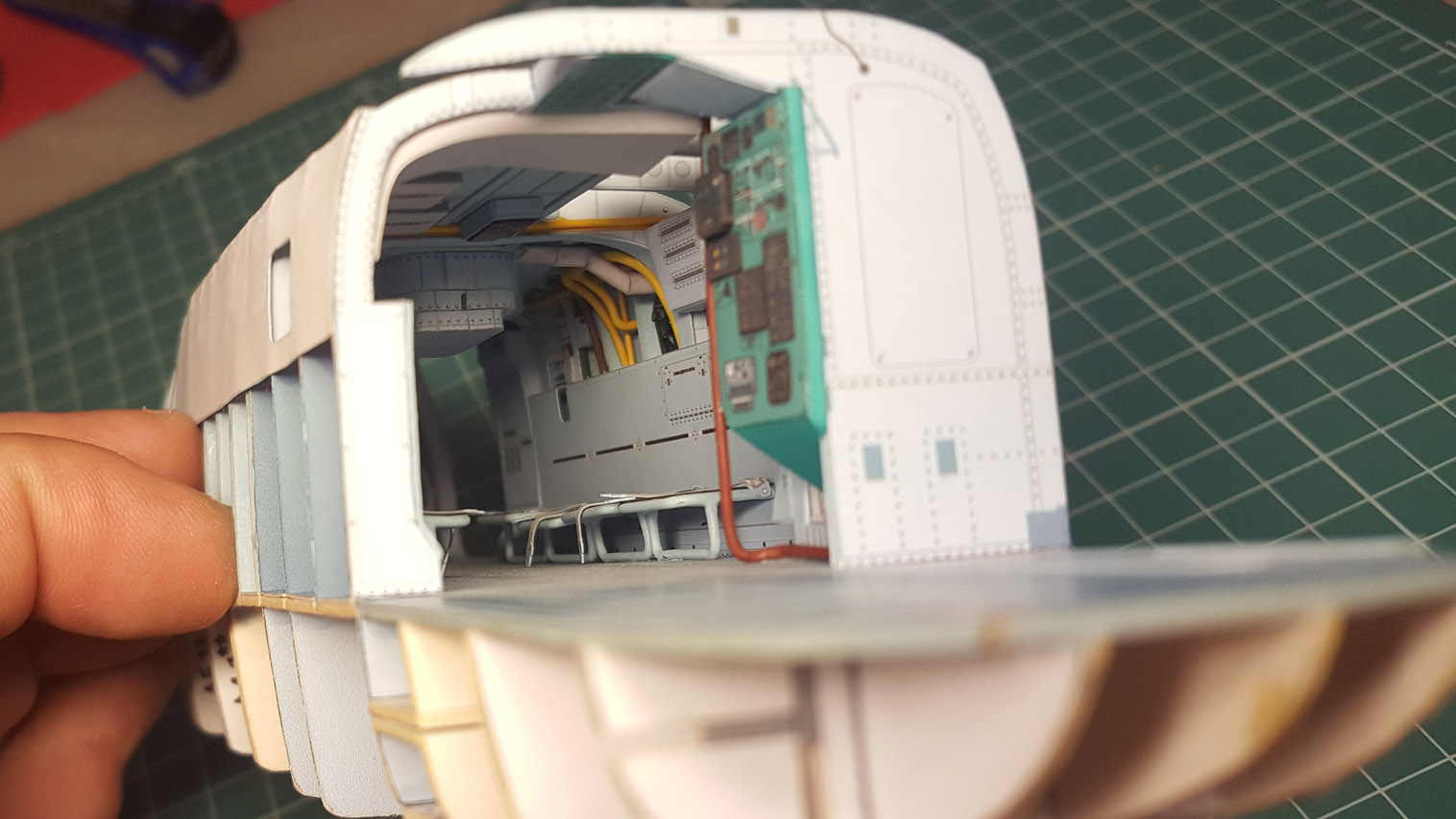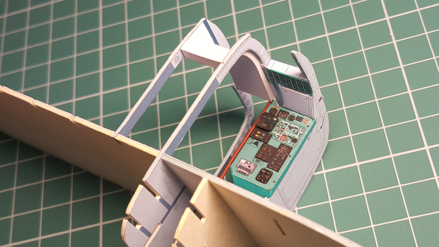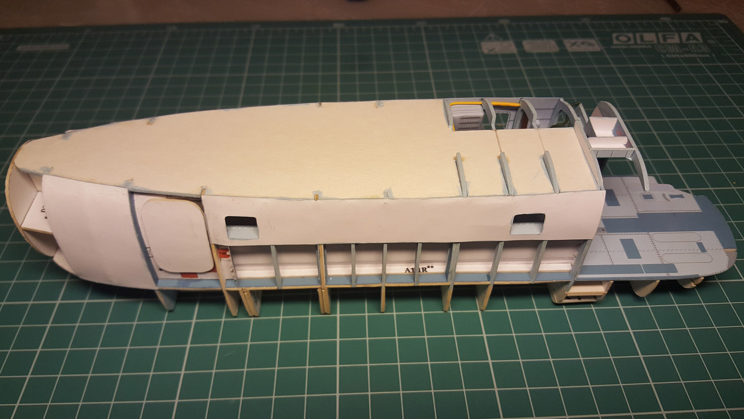 Сделал разводку. Выгнул жгут который проходит над шпангоутом, вклею после приклейки крыши на место. Кожух с каркасом положен на сухо. Его к крыше приклеивать не надо.