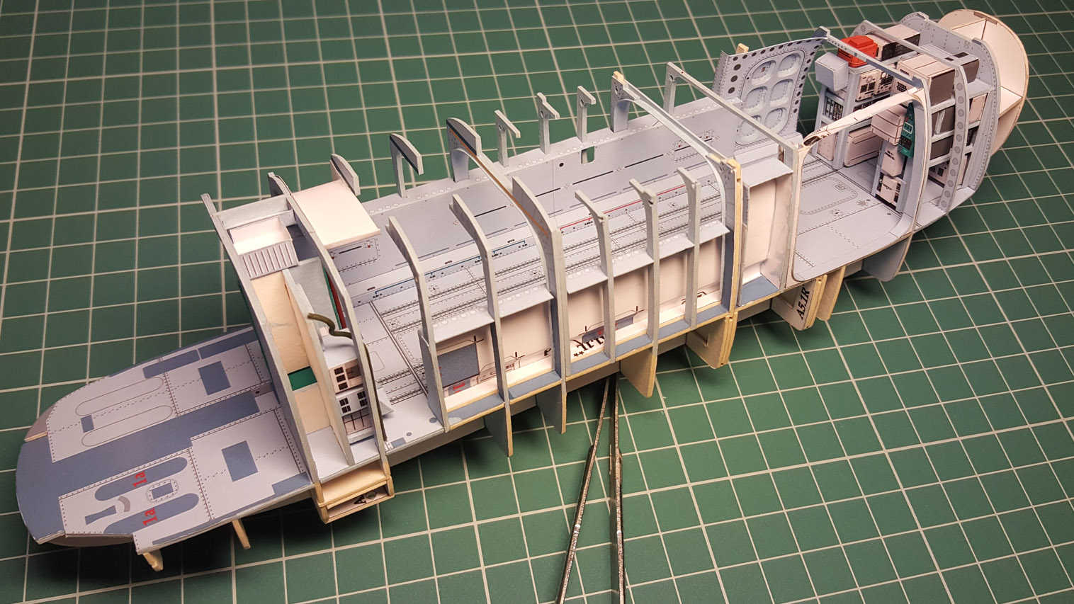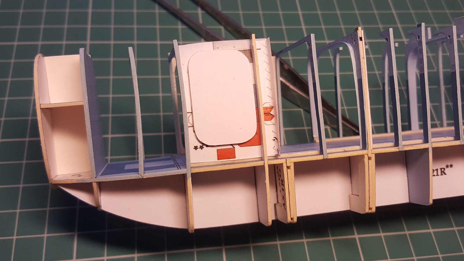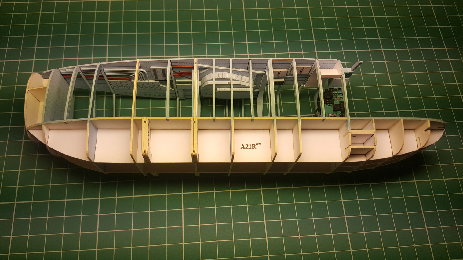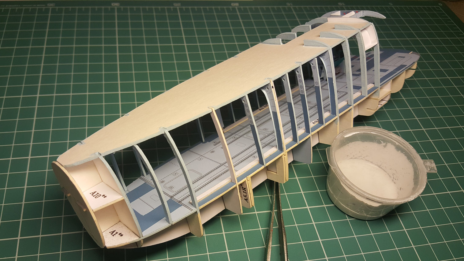 Сделал разводку. Выгнул жгут который проходит над шпангоутом, вклею после приклейки крыши на место. Кожух с каркасом положен на сухо. Его к крыше приклеивать не надо.