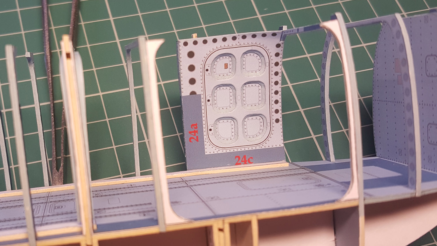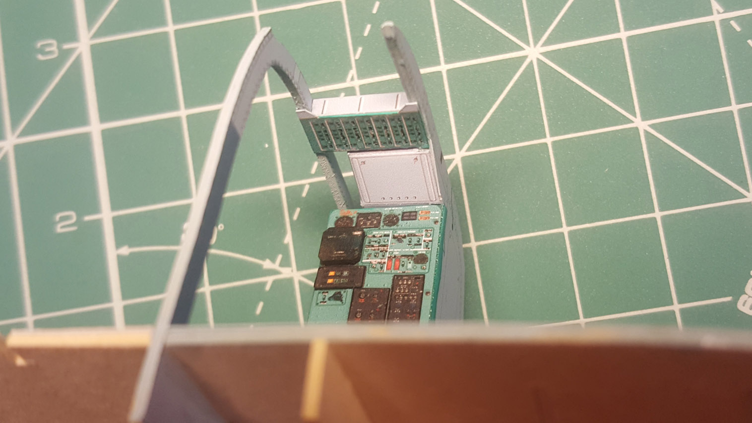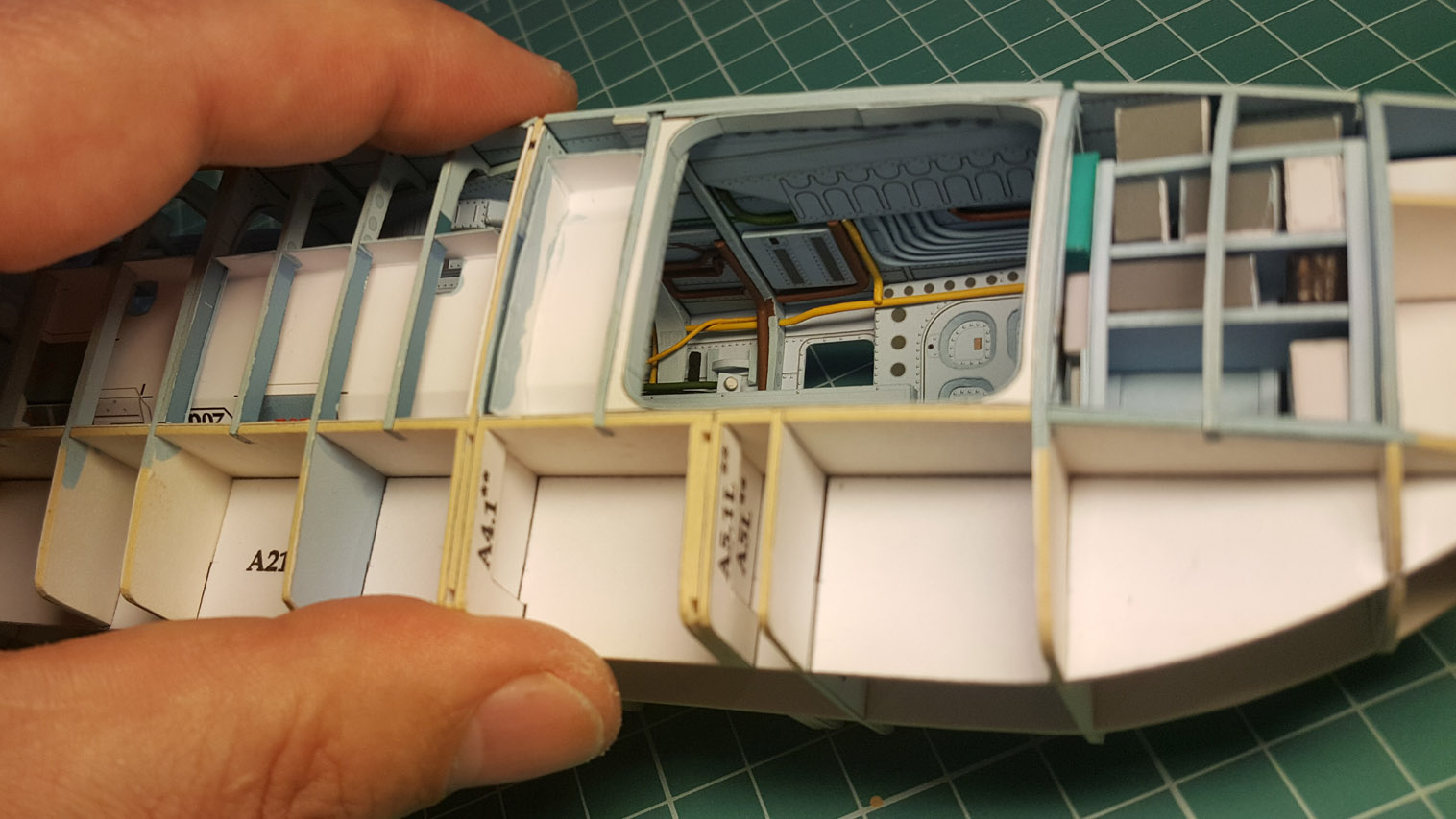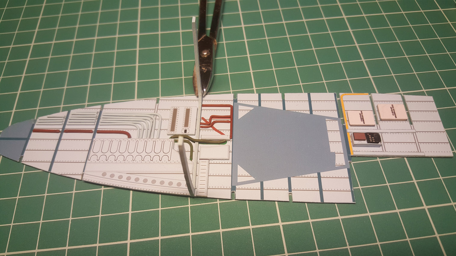 Сделал разводку. Выгнул жгут который проходит над шпангоутом, вклею после приклейки крыши на место. Кожух с каркасом положен на сухо. Его к крыше приклеивать не надо.