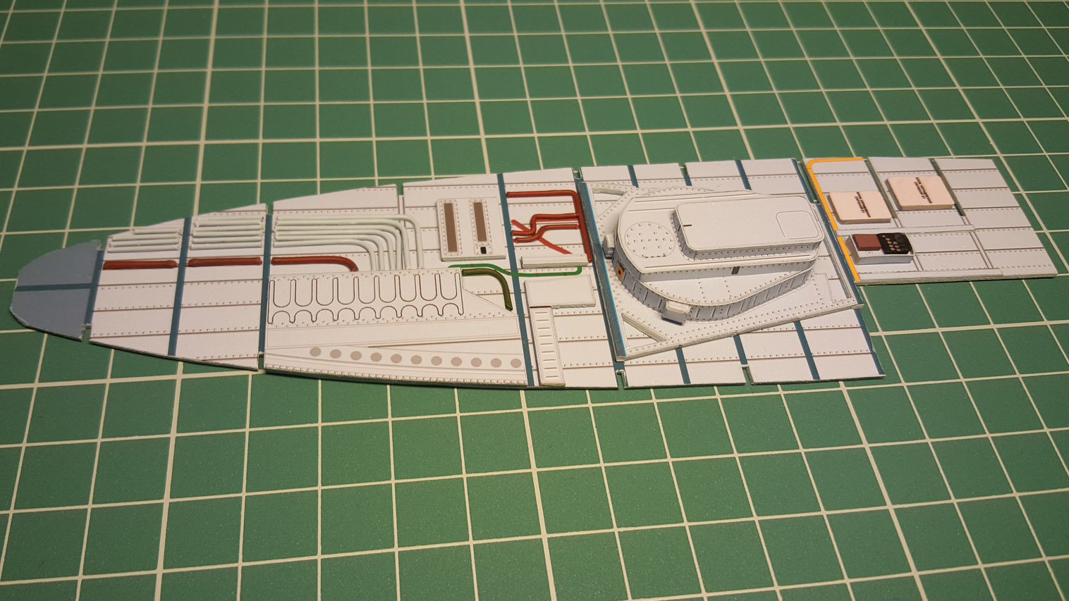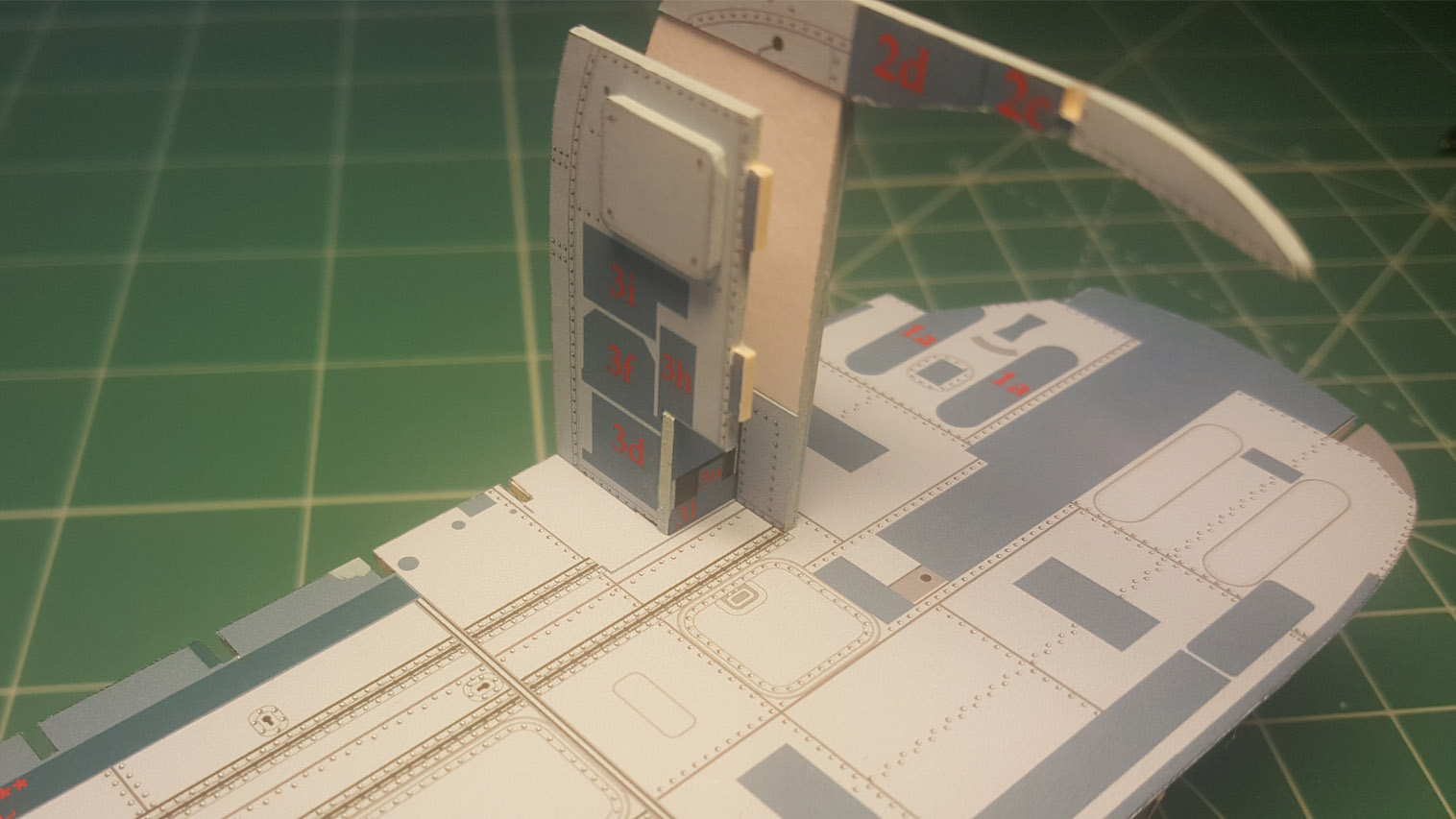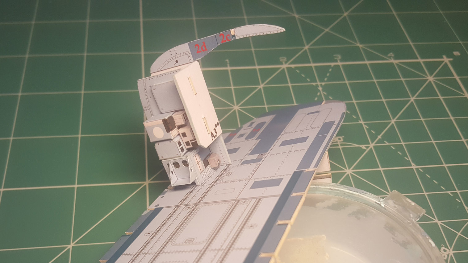 И тут я понял что забыл сделать важную фотку процесса сборки. Дело в том, что сначала вклеивается кожух с каркасом, а лишь после этого вся крыша. Затем приклеиваем задние накладки бота.